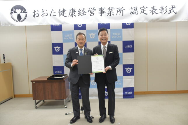 2026年2月6日に行われた認定表彰式では、大田区長から認定証を授与していただき、これからも健康経営を大切に社員一人一人が安心していきいきと働ける環境づくりに努めてまいります。